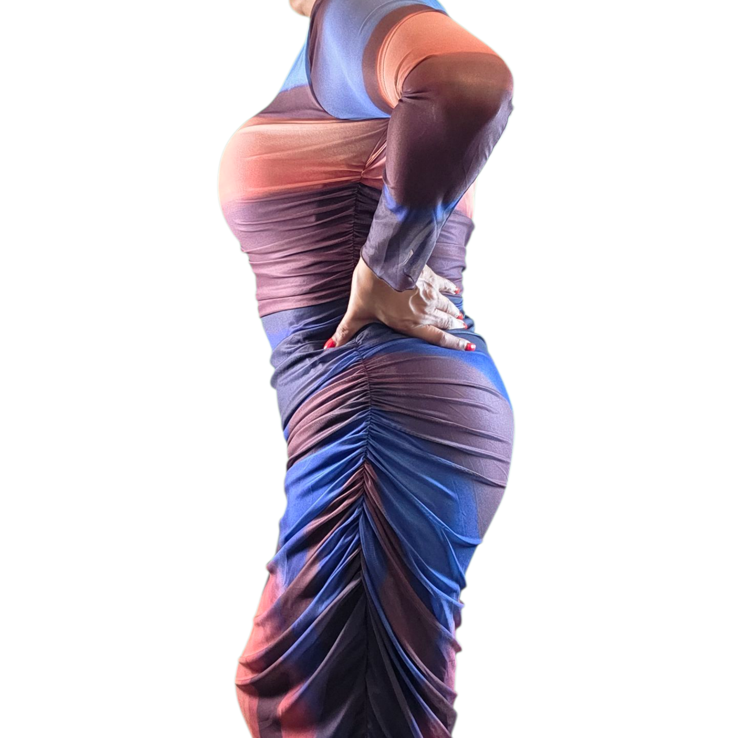 Colorblend Maxi Dress. They come in various vibrant colors. This dress has a special Ruche stitching to hide any imperfection. The sheer sleeves keep you comfortable and stylist. Breathable fabric.